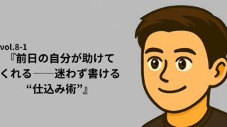 シリーズ②:AGAINST THE TIDE|”会社員向いてないかも” vol.8-1『前日の自分が助けてくれる——迷わず書ける“仕込み術”』― 何度も転職した僕が“会社員向いてないかも”に気づいた話。 当日に頑張らない。前日に“迷わない材料”を置いておく。 元社長の癖は、朝イチで勝負を決めにいくことだった。 だからネタが定まらない日は、会議のように長引く。毎日ブログで勝つ方法は逆で、「勝負を前日に終わらせる」こと。つまり、... 2025.09.11 okin_san シリーズ②:AGAINST THE TIDE|”会社員向いてないかも”