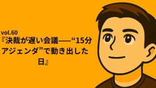 シリーズ①:Re:START NOTE|”止まりながら進む日々” vol.60『決裁が遅い会議——“15分アジェンダ”で動き出した日』 ⏱ 読了目安:約3分 「決めない会議」を、15分で「決める場」に変える。 結論から言う。——会議は長いから遅いのではない。最初の30秒で“何を決めるか”が決まっていないから遅い。 元社長時代、2時間の会議で何も決まらず... 2025.09.16 okin_san シリーズ①:Re:START NOTE|”止まりながら進む日々”