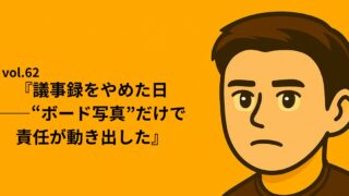 シリーズ①:Re:START NOTE|”止まりながら進む日々” vol.62『議事録をやめた日——“ボード写真”だけで責任が動き出した』 ⏱ 読了目安:約3分 書くより、見えるほうが人は動く。 「議事録、今日は取りません。——このボードの写真が“唯一の記録”です。」 元社長として、私は会議後の“完璧な議事録”に多くの時間を失っていた。きれいに整うほど実行... 2025.09.18 okin_san シリーズ①:Re:START NOTE|”止まりながら進む日々”