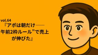 シリーズ①:Re:START NOTE|”止まりながら進む日々” vol.64『アポは朝だけ——“午前2枠ルール”で売上が伸びた』 ⏱ 読了目安:約3分 午前を守る会社は、午後を取り戻す。 「初回アポは、平日午前の2枠だけ。」——この一行が、月次を救った。 元社長として、私は「空いた時間にアポを入れる」運用で、日々の集中が崩れる恐ろしさを味わった。... 2025.09.20 okin_san シリーズ①:Re:START NOTE|”止まりながら進む日々”
