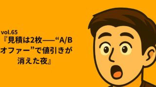 シリーズ①:Re:START NOTE|”止まりながら進む日々” vol.65『見積は2枚——“A/Bオファー”で値引きが消えた夜』 ⏱ 読了目安:約3分 「いくらまで下げられますか?」は、設計で終わらせる。 その夜から、私は見積を1枚で出すのをやめた。 元社長として“払う側”を経験して気づいたのは、単価の話は「含む/含まない」が曖昧だから起きるとい... 2025.09.21 okin_san シリーズ①:Re:START NOTE|”止まりながら進む日々”