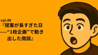 シリーズ①:Re:START NOTE|”止まりながら進む日々” vol.49『提案が長すぎた日——“1枚企画”で動き出した商談』 伝わらない資料は、ないのと同じ。 30枚の完璧な提案書で沈黙をつくり、1枚の荒削りな企画で商談が進んだ。 自信作の“全部盛り”資料は、相手の時間も集中力も奪っていた。決裁者の席に座って初めて、私は「要点の欠落」がどれほど致命... 2025.09.04 okin_san シリーズ①:Re:START NOTE|”止まりながら進む日々”