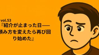 シリーズ①:Re:START NOTE|”止まりながら進む日々” vol.53『紹介が止まった日——頼み方を変えたら再び回り始めた』 「お願い」では動かない。動くのは、相手の負担を設計した“頼み方”。 「誰か紹介してください」——そう言うほど、紹介は減っていった。 元社長の私は、数字が苦しいときほど紹介依頼のメールを乱発した。反応は薄く、既存顧客の温度も下... 2025.09.08 okin_san シリーズ①:Re:START NOTE|”止まりながら進む日々”