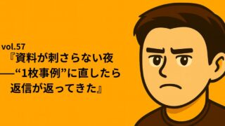シリーズ①:Re:START NOTE|”止まりながら進む日々” vol.57『資料が刺さらない夜——“1枚事例”に直したら返信が返ってきた』 ⏱ 読了目安:約3分 厚い提案より、刺さるのは“1枚の具体”。 夜更けまで作り込んだ完璧な提案書。翌朝、返信はゼロ——。 元社長として痛感したのは、「読む前に判断されている」という事実でした。 そこで全てを削ぎ、... 2025.09.13 okin_san シリーズ①:Re:START NOTE|”止まりながら進む日々”