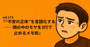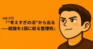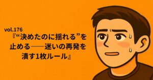 TOP 2025.08.06 2025.07.21vol.176『“決めたのに揺れる”を止める——迷いの再発を潰す1枚ルール』vol.175『“考えすぎの沼”から出る——結論を1個に絞る整理術』vol.174『“不安の正体”を言語化する——頭の中のモヤを3行で止めるメモ術』記事一覧を見る