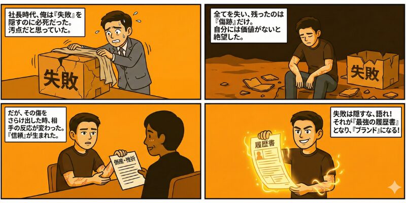 元社長時代、俺は「完璧な自分」を演じることに必死だった。失敗は恥であり、弱みを見せればつけ込まれる。そう信じていたからだ。だが、すべてを失って気づいた。人の心を動かすのは、磨き上げられた実績ではなく、泥の中を這いずり回ってついた「傷跡」の深さの方だったんだ。
