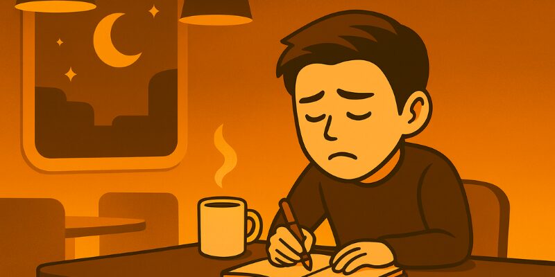 夜のカフェで一人、ノートを前に弱音を書き出しているシーンを象徴した見出し画像