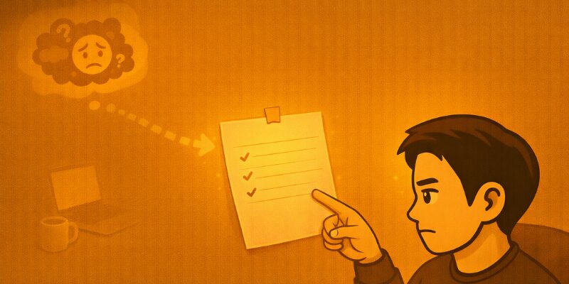 ノート1枚に「決めたこと」を書き、迷いが出たらその1枚を指差して戻るシーンを象徴した見出し画像