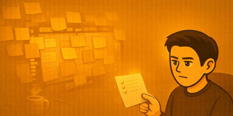 大量の付箋・タブだらけの画面を前に、1枚の「基準メモ」に戻って整理するシーンを象徴した見出し画像