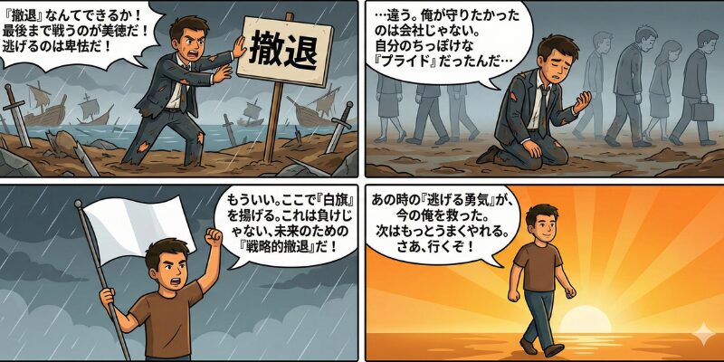 営業の世界でも経営の世界でも、ボロボロになっても戦い続けることが「美徳」とされる。元社長だった俺も、その呪縛に囚われていた一人だった。資金が底をつきかけ、社員の目が死んでいくのを見ながら、それでも「撤退」という二文字を口にするのが怖かったんだ。逃げるのは卑怯だ、情けない——そう自分を責め続けていた。