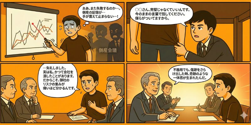 深呼吸をした。震えは完全には止まらなかったけれど、俺は震える手のまま、資料をめくった。 「……お聞き苦しい点があり、失礼しました。実は私、かつて会社を潰したことがあります。だからこそ、御社が抱えるこのリスクの重さが、誰よりも分かるんです。」 スクリプトにはない、むき出しの告白。その瞬間、会場の空気が変わった。クライアントが身を乗り出し、メモを取るペンが止まった。 不器用でもいい。カッコ悪くてもいい。自分の傷跡さえ武器に変えて進むと決めた時、奇跡のような一体感が会議室を包んだんだ。
