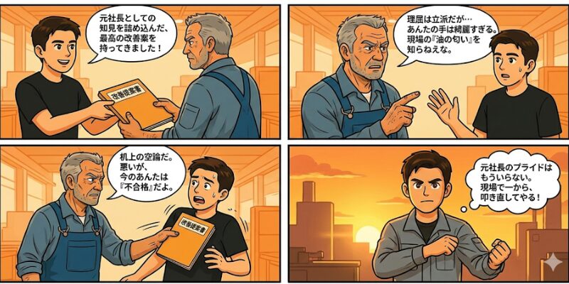 答えに詰まる俺を見て、彼は鼻で笑った。俺が「全体最適」という名の空論を振りかざしている間に、彼らは五感を研ぎ澄ませて現場を守っていた。その圧倒的な実力を前に、俺の言葉は重みを失い、ただの「社長ごっこ」に成り下がったんだ。
